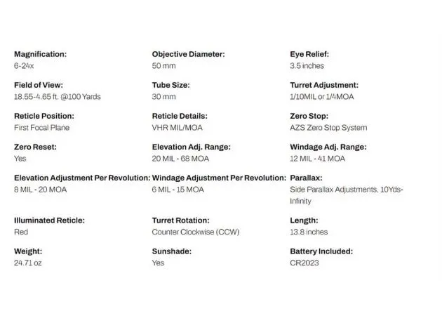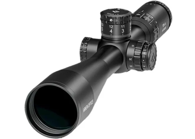 De richtkijker van Arken Optics heeft een minimale vergroting van 6x en een maximale vergroting van 24x, waarmee je lekker dichtbij het doelwit kunt komen. Bij de minimale vergroting heeft de richtkijker een gezichtsveld van 5.6 meter op een afstand van 91.44 meter en bij de maximale vergroting heeft hij een gezichtsveld van 1.4 meter. Met de parallax-turret kun je de parallax verstellen van 9.14 meter (9.14 yards) tot oneindigheid. Over de turrets gesproken; de hoogteturret heeft een maximaal stelbereik van 20 MRAD en de zijturret heeft een stelbereik van 12 MRAD. De zijturret is tevens voorzien van een cap, die met schroefdraad vast te draaien is. Beide turrets hebben een verstelling van 0.1 MRAD per klik.