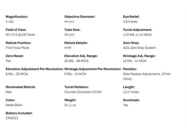 De richtkijker heeft een minimale vergroting van 4x en een mraximale vergroting van 16x, waarmee je lekker dichtbij het doelwit kunt komen. Bij de minimale vergroting heeft de richtkijker een gezichtsveld van 9.14 meter op een afstand van 91.44 meter en bij de maximale vergroting heeft hij een gezichtsveld van 2.28 meter. Met de parallax-turret kun je de parallax verstellen van 9.14 meter (9.14 yards) tot oneindigheid. Over de turrets gesproken; de hoogteturret heeft een maximaal stelbereik van 25 MRAD en de zijturret heeft een stelbereik van 12 MRAD. De zijturret is tevens voorzien van een cap, die met schroefdraad vast te draaien is. Beide turrets hebben een verstelling van 0.1 MRAD per klik.
