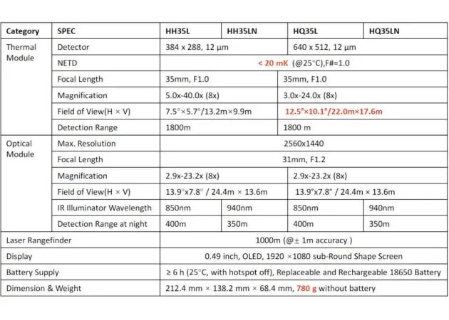 De optische sensor zit dus aan de linkerzijde en hij heeft een resolutie van 2560x1440p. Het objectief heeft een diameter van 31 mm voor een degelijke lichttransmissie. Met een vergroting van 2.9-23.2x kun je met de optische sensor lekker dicht bij datgene komen dat je aan het observeren bent. Door de field of view van 24.4×13.6 meter kun je goed overzicht houden. De thermische sensor zit aan de rechterzijde van de HikMicro Habrok HQ35L warmtebeeldkijker. Die sensor heeft een resolutie van 640x512p en een pixel pitch van 12 µm. Door de indrukwekkende NETD van 20 mK ben je verzekerd van zeer scherpe warmtebeelden waarin je duidelijke details kunt onderscheiden. De thermische sensor heeft een vergroting van 3-24x en het objectief heeft een diameter van 35 mm. Hij heeft een maximaal bereik van 1800 meter en een field of view van 22×17.6 meter.