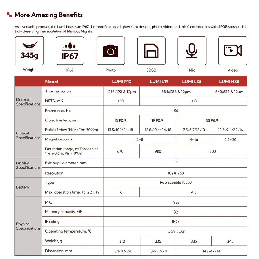 De Lumi -serie is de perfecte mix van kracht , draagbaarheid en precisie . Of u nu in het veld bent of op jacht, deze miniatuur thermische monokijker zorgt ervoor dat u de klus kunt klaren met maximale prestaties .